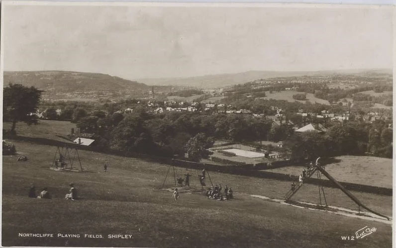 A children’s playground was built in the top field near to the boundary wall with Old Spring Wood, there was a huge slide and other equipment; (see photo) you can still see the concrete bases today. The land in the park was drained and cricket, ladies hockey and football pitches were laid out and rented to 5 ladies hockey clubs and 6 football teams. Then the council made a pond in the woods and built a bandstand for summer concerts which ran ever week in the summer. Many bands came and played, they couldn’t charge admission and often complained that people didn’t donate very much. The park was used by groups such as the League of Nations and the Windhill Industrial Co-Op held it children’s gala on the playing fields and many churches used the woods and meadows. The main gates were put in and included a bust of Sir Norman Rae, but they had to move a kiosk to get the main entrance sorted. Towards the end of the decade the golf club wanted to stop the public using the links and asked to put up barbed wire fences. The council refused and agreed to terminate their lease.